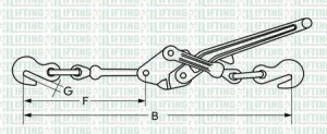 Diese Schwerlast-Kettenratsche ist geeignet für Ketten von 5/16″ (Grad 70) bis 3/8″ (Grad 43) mit einer Arbeitslastgrenze von 5400 Pfund (2449 kg). Sie wird häufig in der Landwirtschafts- und Transportindustrie verwendet, um Ladungen auf Anhängern während des Transports zu sichern.
