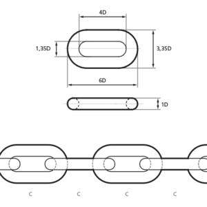 | Durchmesser (mm) | Abmessungen des Glieds | Grau 2 (BM2) – Testlast (kN) | Grau 2 (BM2) – Minimale Bruchlast (kN) | Grau 3 (BM) – Testlast (kN) | Grau 3 (BM) – Minimale Bruchlast (kN) | Außenlänge (A) | Externe Breite (B) |